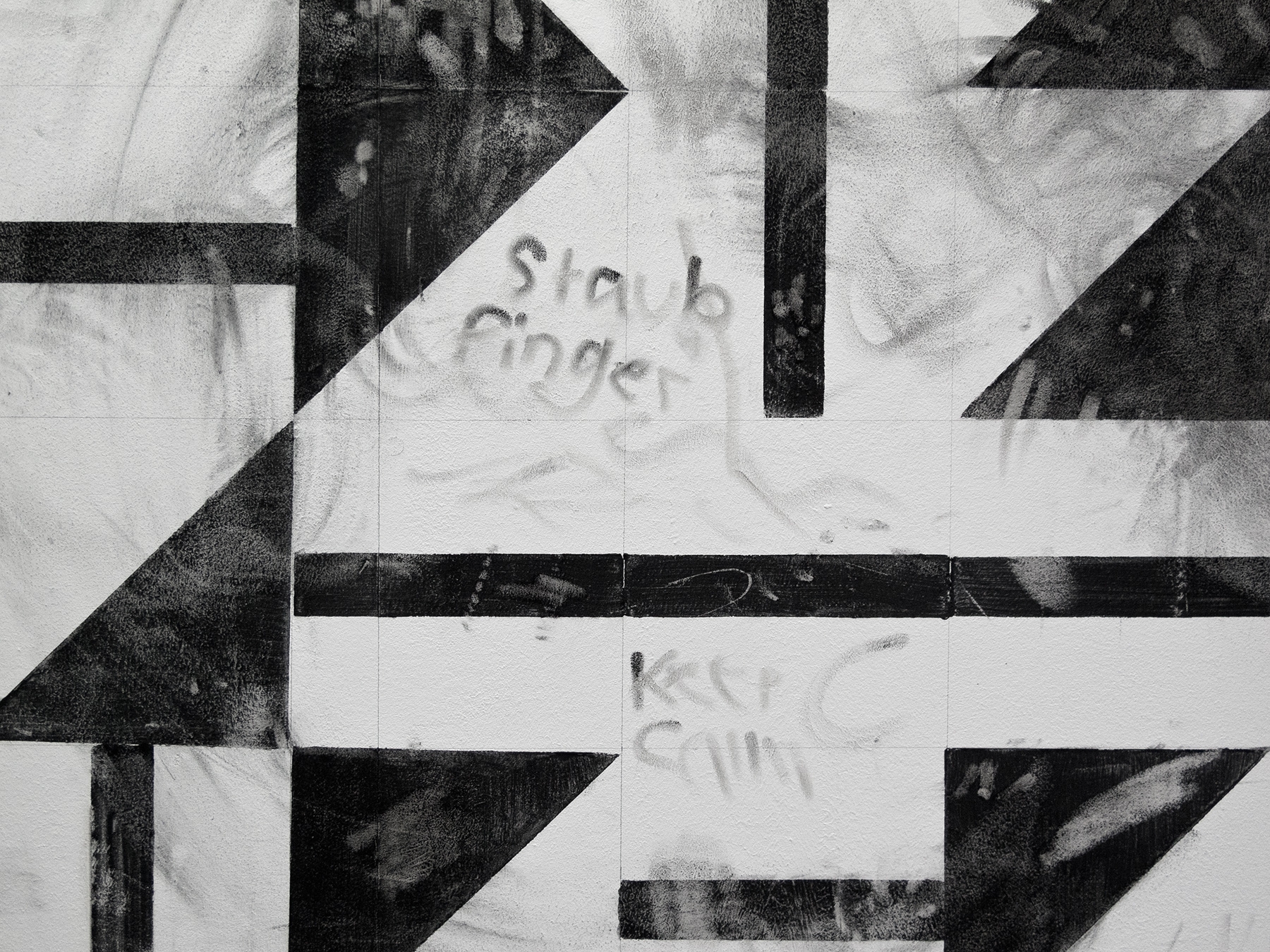 The installation for die raum cuts the space diagonally in half, transforming it into a three-dimensional rendering of one of Bulcão’s tile designs, which is also represented in the form of a charcoal wall painting. The use of charcoal references the initial outlining process of handmade Portuguese “Azulejo” tiles, but the ephemeral character of this medium also points to the passing of time, and the fragile state of ideologies and “faded” value systems.