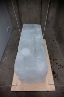 Opera II is a sculptural thermodynamic operation — hence the title referring to the latin origins of the word “opera” as “work” or “labour”. The installation consists of a monolithic human-scale ice block placed on a wooden structure, suspended by elastic cords which are attached to the four corners of the ceiling. As a balanced system submitted to the inexorable forces of gravity and thermodynamism the installation will commence “operation” as the ice begins to slowly melt.